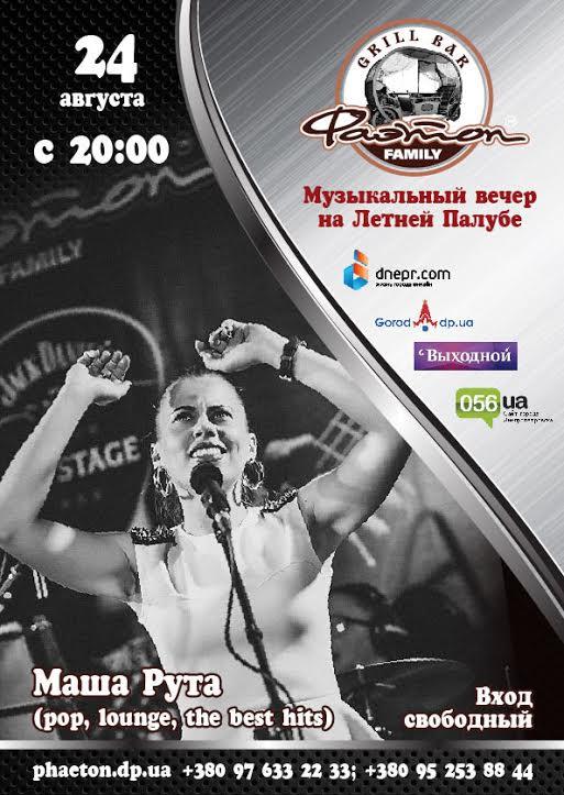 В среду, 24 августа, приглашаем ощутить летнее, теплое настроение и отпраздновать День Независимости в гостеприимном Фаэтоне. Летняя Палуба ждет всех Гостей на свежем воздухе, прямо на крыше гриль-бара. А скрасить Ваш праздничный вечер, наполнив его ноткой романтики поможет вокал нашей Гостьи сцены Фаэтона Марии Руты. Приятный лаунж, популярные и известнейшие хиты, проникающий вокал, элегантность авторских подач. Ждем Вас в Гости!