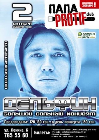 Музика 2 октября, ДЕЛЬФИН, ПАПАPROTIFF By Татьяна Иванова - 03.09.2010 00:00 0 20 Поділитися FacebookViberTelegramTwitterWhatsAppPinterestPrintEmail 2 октября, ПАПАPROTIFF Большой сольный концерт Дельфина! 2 октября 2010 года, 15:00ПАПАPROTIFF ул. Ленина, 6 Тел.: 785-55-60 Цена билета: предпродажа: 120 – 130 грн., в день концерта 150 грн.