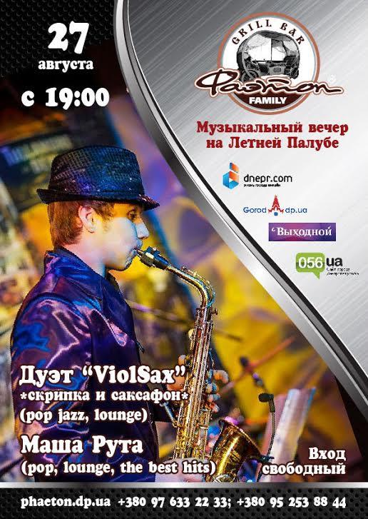 Сцена гриль-бара представит Вамдуэт прекрасных молодых людей ViolSax, которые подарят Вам радость и магию музыки, от исполненных известных мелодий на скрипке и саксофоне, в тандеме с обворожительной Марией Рутой музыканты подберут и исполнят для Вас только лучшие произведения и композии!