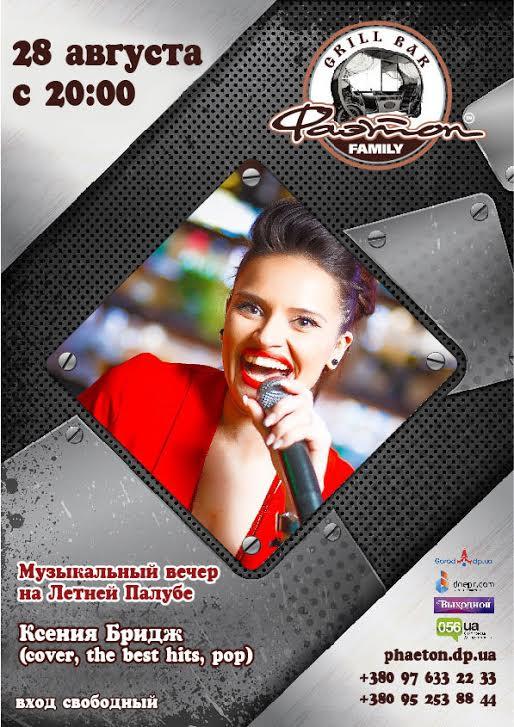 В воскресенье, 28 августа, приглашаем ощутить летнее, теплое настроение гостеприимного Фаэтона. Летняя Палуба ждет всех Гостей на свежем воздухе, прямо на крыше гриль-бара. А скрасить Ваш вечер, наполнив его ноткой романтики поможет вокал нашей Гостьи сцены Фаэтона Ксении Бридж. Приятный лаунж, популярные и известнейшие хиты, проникающий вокал, элегантность авторских подач. Ждем Вас в Гости!