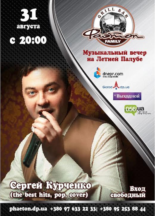Вечером, 31 августа, с последним жарким настроением и задором приглашаем распрощаться с прекрасной летней порой. И, конечно же, Вас ждет у себя гостеприимный ‘Фаэтон’, весь вечер для Вас будут петь и играть зачаровывающий и наслаждающий вокал Сергея Курченко. Для Вас будут исполнены лучшие, популярные и не угасающие композиции в фирменных подачах и обработках. Приходите, не пожалеете!