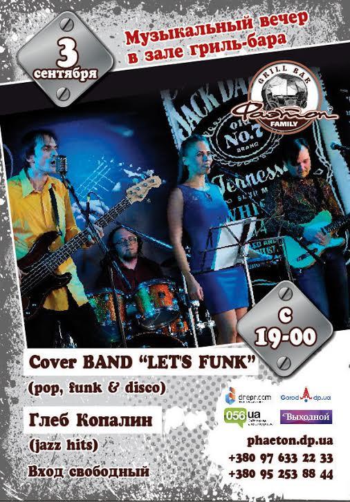 3 сентября, в субботу, гриль-бар Фаэтон приглашает встретить сердце выходных и первую осеннюю субботу. А начало веселья предлагаем встретить яркими эмоциями и настоящим задором! Весь вечер со сцены Фаэтона для Вас будут звучать настоящие и незабываемые хиты в стилях pop, funk & the best hits от эффектных Cover BAND Let’s FUNK, в тандеме с харизматичным и обаятельным вокальным Гостем Фаэтона Глеба Копалиным, музыканты подарят Вам вечер настоящего отдыха и расслабления.