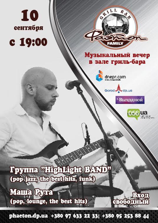 Фаэтон настаивает, что нужно с удовольствием проводить каждый свой выходной. А в эти выходные мы отдохнем по особенному, так как Днепропетровск отмечает свой великий день!Ждем Вас 10 сентября, на осеннюю, но еще по-летнюю теплую субботу в Гостях у самого необычного гриль-бара в городе. Мыпорадуем Вас НОВЫМИ вкусными нотами и музыкальными композициями! Сцена гриль-бара будет заполнена яркими и неутомимыми виртуозами своего дела группой HighLight BAND со своим дебютом! Для Вас прозвучат лучшие хиты, проверенные временем, но это еще не все – незабываемое впечатление проходящего вечера обеспечит и поддержит на Летней Палубе наша яркая и обворожительная Мария Рута.