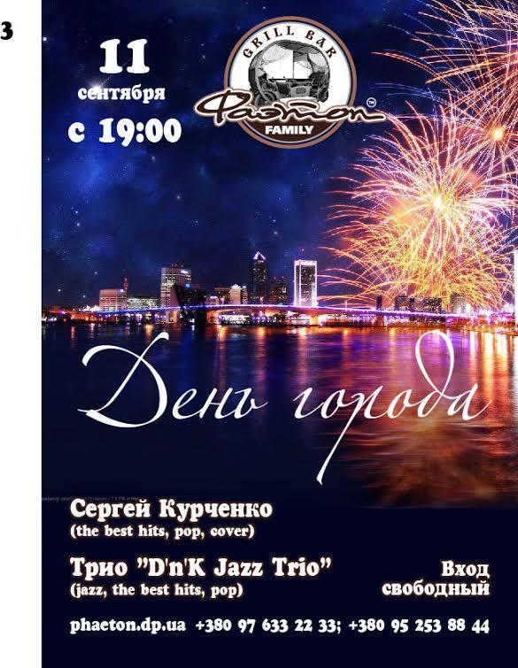 11 сентября, в воскресенье, гриль-бар Фаэтон приглашает встретить выходные яркими эмоциями и настоящим задором, ведь Днепропетровск отмечает ДЕНЬ ГОРОДА! Вечер обещает быть очень интересным, так как гостеприимный Фаэтон представит яркое и необычное трио D’n’K Jazz Trio потрясающих творцов, музыкантов и просто прекрасных людей: