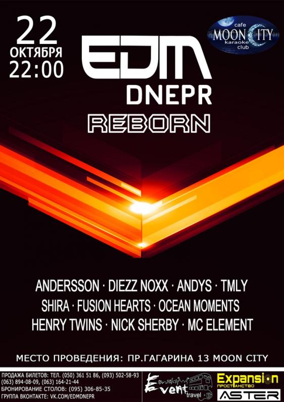 Друзья! С радостью сообщаем Вам, что в рамках проекта EDM Dnepr, 22 октября в клубе Moon City, по адресу Днепр, пр.Гагарина 13, в 22:00 стартует очередная вечеринка EDM Dnepr REBORN!