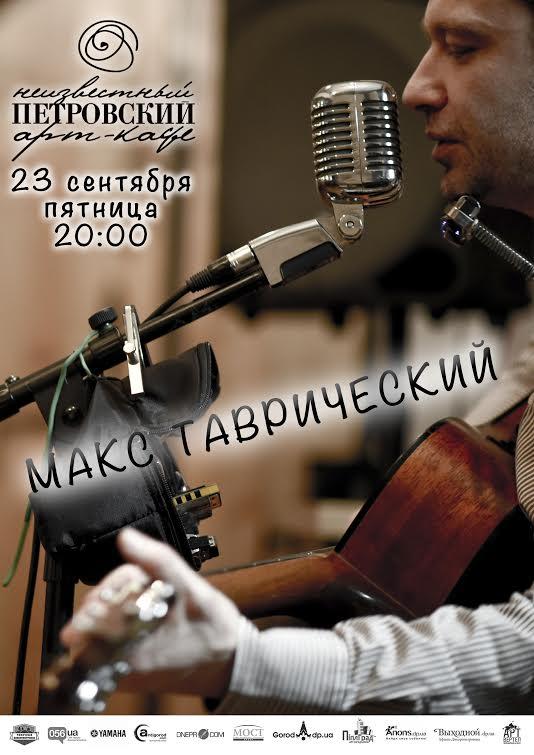 23 сентября арт-кафе Неизвестный Петровский приглашает посетить концерт одного из самых известных блюзменов Украины Макса Таврического! Обновленная программа будет состоять как из классики блюза, рок, фолк и вечнозеленых композиций, так и авторского материала.