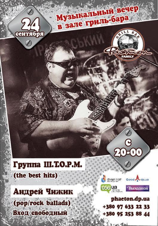Суббота, 24 сентября, порадует Вас живым ритмом – в гостях фееричная группа Ш.Т.О.Р.М.. Лучшие поп-, рок-, джаз-хиты, манящая игра электрогитары и отличное настроение – все это ждет вас в субботний вечер в гриль-баре Фаэтон. Но это еще не все приятное впечатление создаст наш Гость Андрей Чижик. Лучшие поп/рок баллады , джазовые исполнения, приятный лаундж, теплая, почти домашняя атмосфера, у нас только истинные традиции..