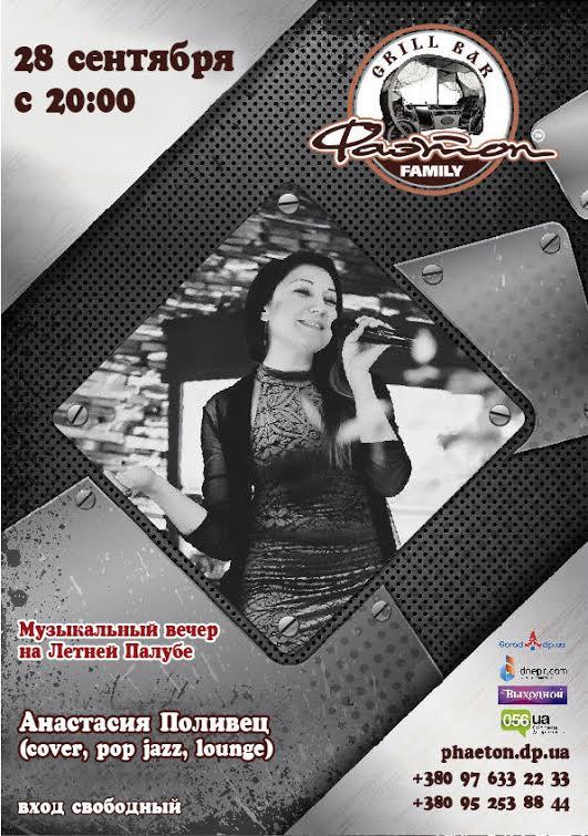 В среду, 28 сентября, приглашаем Вас провести вечер с яркими эмоциями, отличным настроением и вкусными блюдами. На сцене гриль-бара представитель прекрасной и романтичной стороны, обворожительная Гостья с прекрасным и харизматичным вокалом Анастасия Поливец. Приходите, ждем в Гости!