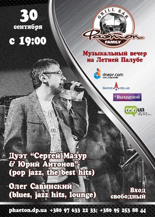 30 сентября, в последнюю пятницу первого осеннего месяца, гриль-бар Фаэтон приглашает встретить выходные яркими, теплыми эмоциями и настоящим задором! Вечер обещает быть очень интересным, так как гостеприимный Фаэтон представит Вам яркий и необычный дуэт двух потрясающих творцов и просто прекрасных людей: Сергей Мазур & Юрий Антонов. Так же подогреет и поддержит атмосферу удовольствия наш любимец публики вокалист Олег Савинский. Для Вас прозвучат популярные хиты и композиции в стилях pop, jazz & the best hits. Дарите себе незабываемые моменты в самом необычном гриль-баре в городе..