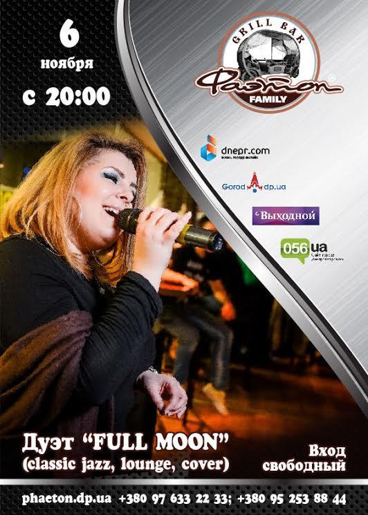 6 ноября приятное впечатление и ощущение того, что вы оказались в американской глубинке, дадут Вам ощутить звуковые такты и вокал Гостей вечера дуэта FULL MOON. Лучшие джазовые исполнения, приятный лаундж, теплая, почти домашняя атмосфера не сможет оставить Вас равнодушными.
