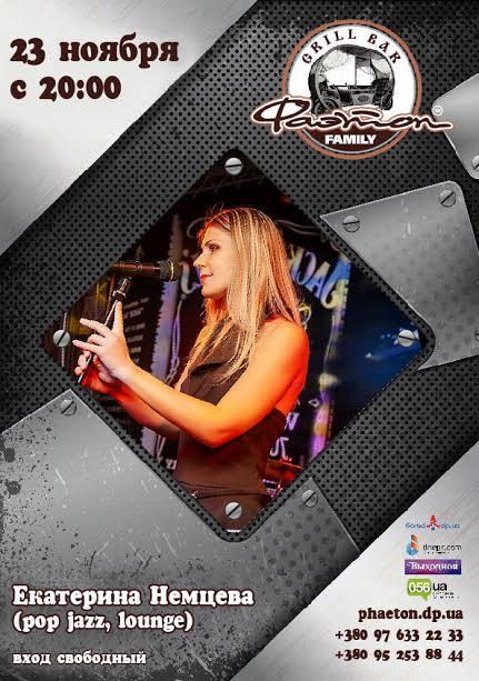В среду, 23 ноября, приглашаем ощутить согревающее настроение гостеприимного Фаэтона. А скрасить Ваш вечер, наполнив его ноткой романтики поможет вокал нашей Гостьи сцены Фаэтона обворожительная Екатерины Немцевой. Приятный лаунж, популярные и известнейшие хиты, проникающий вокал, элегантность авторских подач. Ждем Вас в Гости!