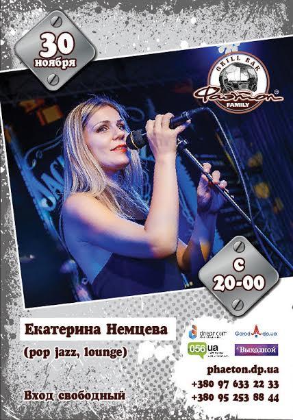 В среду, 30 ноября, Фаэтон приглашает всех попрощаться в капризной осенью и насладится приходом зимней поры, и конечно, непременно ждет у себя в Гостях на согревающую атмосферу, дабы провести вечер с яркими эмоциями, отличным настроением и вкусными блюдами. На сцене гриль-бара представитель прекрасной и романтичной стороны, обворожительная Гостья с прекрасным и харизматичным вокалом Екатерина Немцева. Приходите, ждем в Гости!