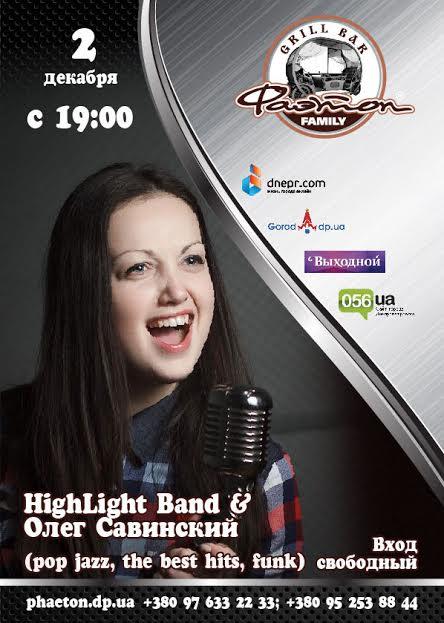 2 декабря, в первую пятницу зимней поры, гриль-бар Фаэтон приглашает встретить отличное начало выходных. А начало веселья предлагаем встретить яркой музыкальной атмосферой, отличными танцевальными композициями и задорным настроением. Весь вечер со сцены Фаэтона для Вас будут звучать настоящие и незабываемые хиты в стилях pop jazz, funk & the best hits от эффектных Cover BAND Highlight BAND, в тандеме с харизматичным и обаятельным Олегом Савинским, музыканты подарят Вам вечер настоящего отдыха и расслабления.
