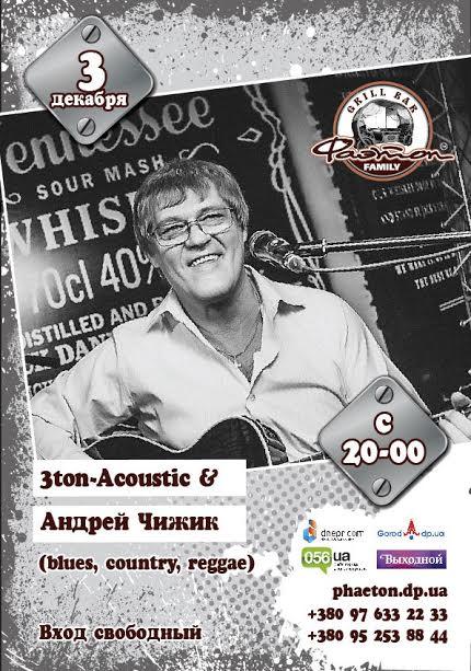 3 декабря, в субботу, гриль-бар приглашает в Гости и гарантирует непередаваемые впечатления и эмоции. Фаэтон с радостью представляет Вам Гостей виртуозов кантри/регги музыки и всемирных популярных блюзовых хитов, харизматичных и неутолимых группу 3ton-Acoustic! А так же разогреет и поддержит атмосферу комфорта приятные вокальные сюрпризы от нашего Гостя Андрея Чижика! Атмосфера уюта и комфорта уже ждет Вас в самом необычном гриль-баре в городе! Ух, суббота, мы ждем тебя!