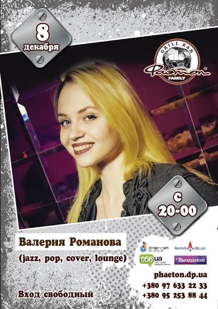 В четверг, 8 декабря, приглашаем Вас расслабиться и насладиться ярким выступлением Гостьи сцены Фаэтона. Традиционно, Вас ждет множество вкусных блюд, фирменное не фильтрованное пиво, отличное настроение и музыкальные сюрпризы от элегантной Валерии Романовой. Приходите и наслаждайтесь!