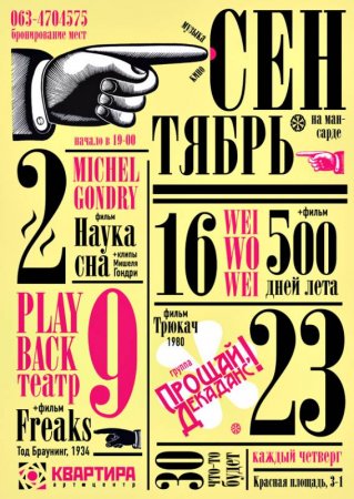 На киноквартирнике вы будете иметь возможность насладиться музыкой группы ‘Прощай декаданс’ с ее новой программой ‘Цветное подполье’. А так же посмотреть фильм ‘Трюкач’ попивая чаек с бубликами. Группа Прощай, Декаданс! основана в 2006 году. Основателями группы являются Андрей Поспелов автор музыки и текстов, и Лаврик легендарный днепропетровский блюзмен. Результатом этого тандема стали песни с постдекаденсткими текстами и блюзовым акцентом. Кроме концертов с неповторимым вокалом Марии и андерграундным Андрея, группа проводит вечеринки в стиле декаданс, которые называет DECADENCE-PARTY. Музыка группы блюз, рок-н-ролл, буги, рок-баллады, фанки. В исполнении Марии с элементами джаза.