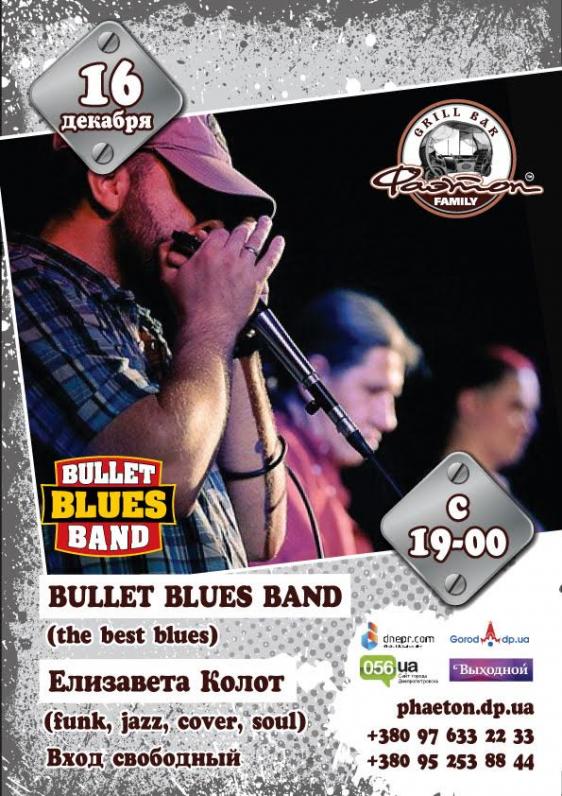16 декабря, в пятницу, гриль-бар Фаэтон приглашает встретить отличное начало выходных зажигательную блюзовую пятницу. А начало веселья предлагаем встретить яркими эмоциями и настоящим задором! Весь вечер со сцены Фаэтона для Вас будут звучать настоящие и незабываемые блюзовые хиты от эффектных виртуозов группы Bullet Blues BAND, в тандеме с харизматичной и обаятельной Елизаветой Колот, музыканты подарят Вам вечер настоящего отдыха и расслабления.