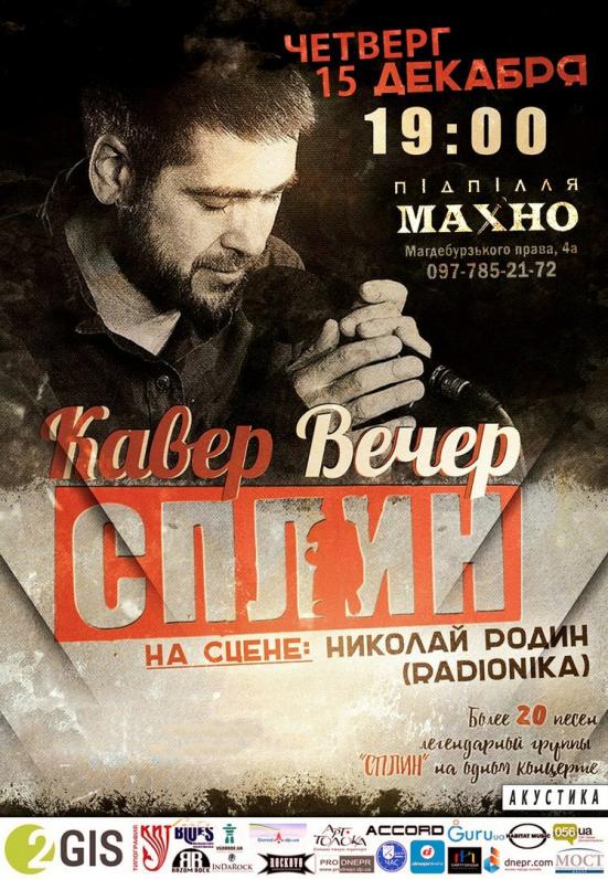 Гратиме для вас Коля Родін (‘Radionika’) – талановитий музикант, що прокладає шлях для пісень ‘Сплін’ через своє сердце та виконує їх з душею. Ці концерти – це завжди щире та особливе.