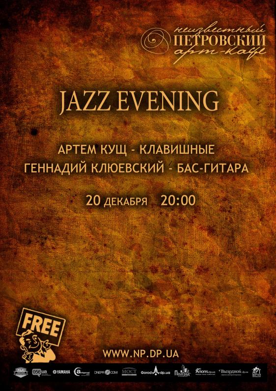 Этот холодный декабрьский вечер будет согрет мягкими тембрами электропиано и бас гитары, наполнен изящными джазовыми гармониями и пульсирующими ритмами. В уютной атмосфере дуэта можно будет собраться с мыслями, заглянуть в себя и помечтать.