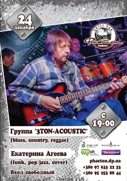 24 декабря, в субботу, гриль-бар приглашает в Гости и гарантирует непередаваемые впечатления и эмоции. Фаэтон с радостью представляет Вам Гостей виртуозов кантри/регги музыки и всемирных популярных блюзовых хитов, харизматичных и неутолимых группу 3ton-Acoustic! А так же разогреет и поддержит атмосферу комфорта приятные вокальные сюрпризы от нашей Гостьи Екатерины Агеевой! Атмосфера уюта и комфорта уже ждет Вас в самом необычном гриль-баре в городе! Ух, суббота, мы ждем тебя!