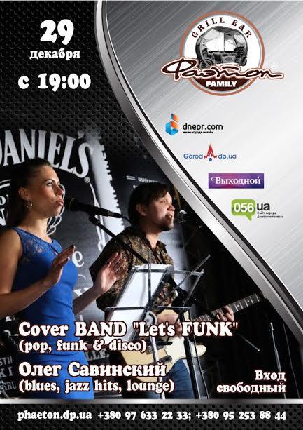 29 декабря, в четверг, гриль-бар Фаэтон приглашает в Гости и гарантирует непередаваемые впечатления и эмоции. А начало веселья предлагаем встретить яркой музыкальной атмосферой, отличными танцевальными композициями и задорным настроением. Весь вечер со сцены Фаэтона для Вас будут звучать настоящие и незабываемые хиты в стилях pop, funk & the best hits от эффектных Cover BAND Let’s FUNK, в тандеме с харизматичным и обаятельным Олегом Савинским, музыканты подарят Вам вечер настоящего отдыха и расслабления.