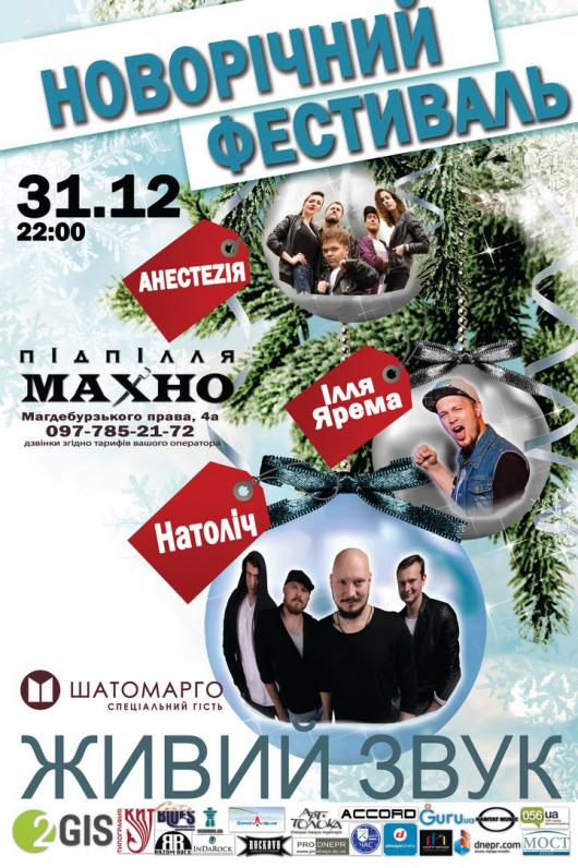 Новорічний фестиваль 2017 в МахноПБ! Найяскравіша подія цього року з улюбленими гуртами НАТОЛІЧ та Анестезія та зірковим ведучим майже всіх фестивалів України Ілля Ярема! Це буде незабутня подія в Вашому житті! Море подарунків, конкурсів, сюрпризів та найдушевніша атмосфера родини МахноПАБ!