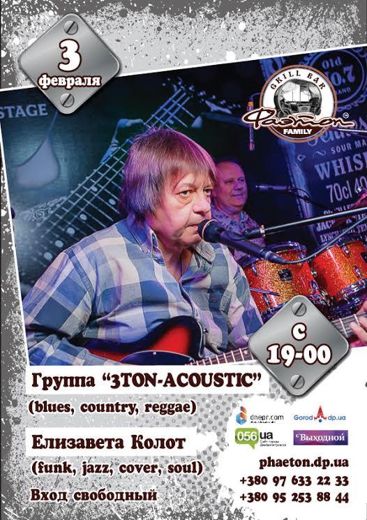 3 февраля, в субботу, гриль-бар приглашает в Гости и гарантирует непередаваемые впечатления и эмоции. Фаэтон с радостью представляет Вам Гостей виртуозов кантри/регги музыки и всемирных популярных блюзовых хитов, харизматичных и неутолимых группу 3ton-Acoustic! А так же разогреет и поддержит атмосферу комфорта приятные вокальные сюрпризы от нашей Гостьи Елизаветы Колот! Атмосфера уюта и комфорта уже ждет Вас в самом необычном гриль-баре в городе! Ух, пятница, мы ждем тебя!