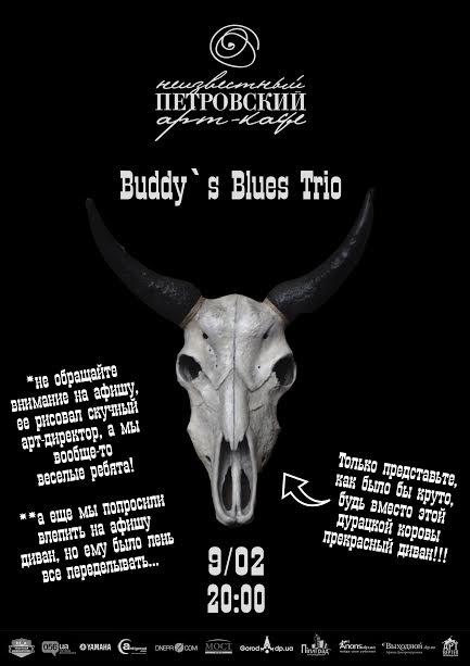 Если Ваша жизнь невыносимо тяжела или хочется, чтобы она такой казалась, если Ваша девушка изменяет с Вашей любовницей, если Вам не за что пожаловаться подругам на своего парня и вместо черной кошки дорогу перебегает белый единорог, то Вам просто необходимо послушать порцию отборного блюза от Buddy’s Blues Trio!