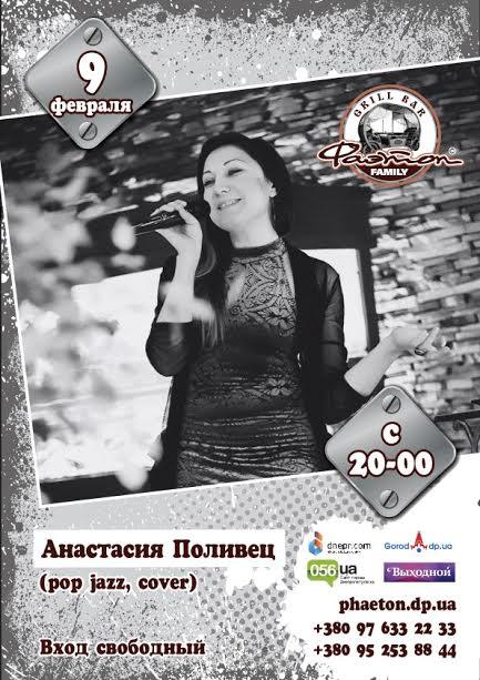 В четверг, 9 февраля, приглашаем Вас расслабиться и насладиться ярким выступлением Гостьи сцены Фаэтона. Традиционно, Вас ждет множество вкусных блюд, фирменное не фильтрованное пиво, отличное настроение и музыкальные сюрпризы от элегантной Анастасии Поливец. Приходите и наслаждайтесь!