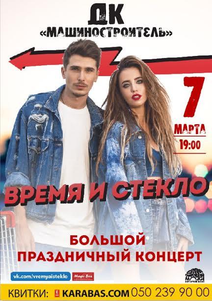 7 марта в ДК ‘Машиностроителей’ состоится незабываемый праздник весны и женского дня с ‘Время и Стекло’! Начало в 19:00.