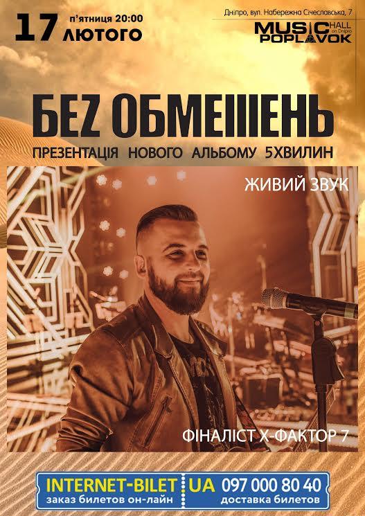 БЕЗ ОБМЕЖЕНЬ вирушають в тур Україною на підтримку нового альбому! Він вийде на початку лютого і буде називатись, як і перший сингл – 5хвилин. Цю пісню гурт презентував восени і вона вже встигла підкорити багато сердець. Гурт БЕЗ ОБМЕЖЕНЬ відомі українські рок-романтики. Це гурт, який не заганяє себе в жорсткі рамки формату чи стилю, без кордонів в почуттях… В музиці відчувається живий саунд, справжній драйв і соковитий смак життя.