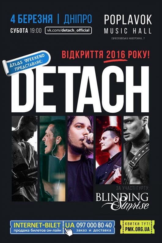 Одна из самых востребованных групп фестивального лета 2016, претенденты на Открытие года по версии премии YUNA, единственная за всю историю существования музыкальных талант-шоу в Украине группа подобного жанра, которая не только попала на прямые эфиры, но и прошла в суперфинал, оставив далеко позади более форматных музыкантов и это далеко не все, что можно сказать про DETACH.