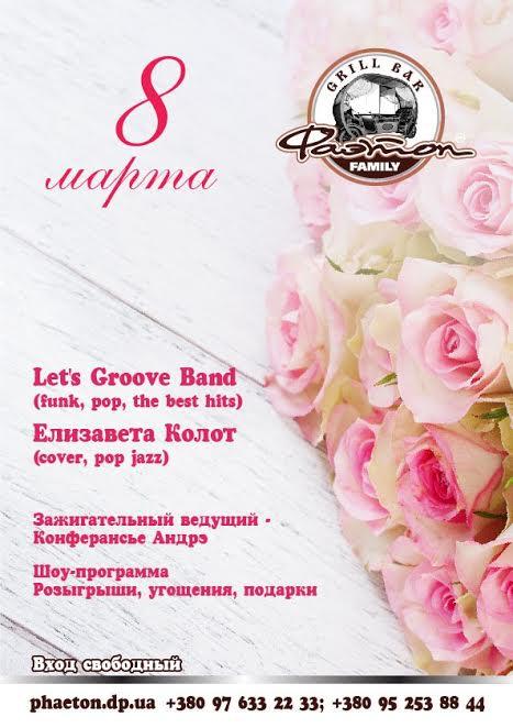 В среду, 8 марта, Фаэтон будет радовать и удивлять всех наших милых дам. Насыщенность, яркость и первые ноты этого вечера празднования торжества в гриль-баре начинают зажигательная и романтичная представительница прекрасной женской стороны обворожительная Елизавета Колот. А следом за ней, дабы Вы насладились прекрасным времяпровождением, на сцену гостеприимного Фаэтона взойдут виртуозы, таланты и просто прекрасные музыканты, которые не дадут Вам возможности усидеть на месте неутомимые – группа Lets Groove BAND. На протяжении вечера хороший харизматичный ведущий и шоу-мэн Конферансье АНДРЭ будет угощать Всех задорным настроением, конкурсами, сюрпризами, розыгрышами и подарками. А веселые мимы будут помогать Вам сохранять настоящий заряд драйва.