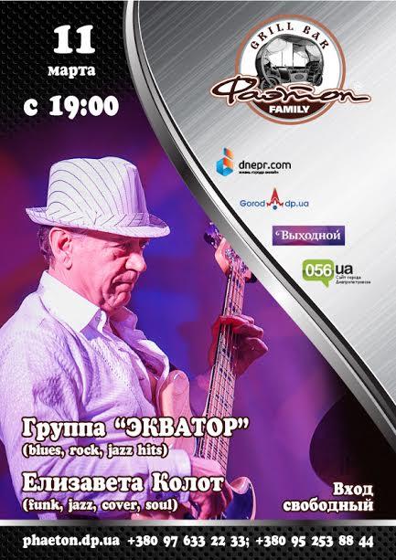 11 марта гриль-бар приглашает в Гости и гарантирует непередаваемые впечатления и эмоции. Фаэтон с радостью представляет Вам Гостей виртуозов поп/рок- музыки, харизматичных и неутолимых группу Экватор! А так же разогреет и поддержит атмосферу комфорта приятные вокальные сюрпризы от нашей Гостьи Елизаветы Колот! Атмосфера уюта и комфорта уже ждет Вас в самом необычном гриль-баре в городе! Ух, суббота, мы ждем тебя!