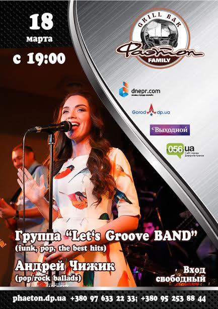 Фаэтон с радостью представляет Вам Гостей! Группа ‘Let’s Groove BAND’. А так же разогреет и поддержит атмосферу комфорта фееричный и грациозный, участник второго сезона шоу-проекта X-Фактор Андрей Чижик! Атмосфера уюта и комфорта уже ждет Вас в самом необычном гриль-баре в городе!