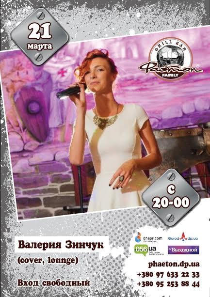 Во вторник, 21 марта, приглашаем Вас расслабиться и насладиться ярким выступлением Гостьи сцены Фаэтона. Традиционно, Вас ждет множество вкусных блюд, фирменное не фильтрованное пиво, отличное настроение и музыкальные сюрпризы от элегантной Валерии Зинчук. Приходите и наслаждайтесь!