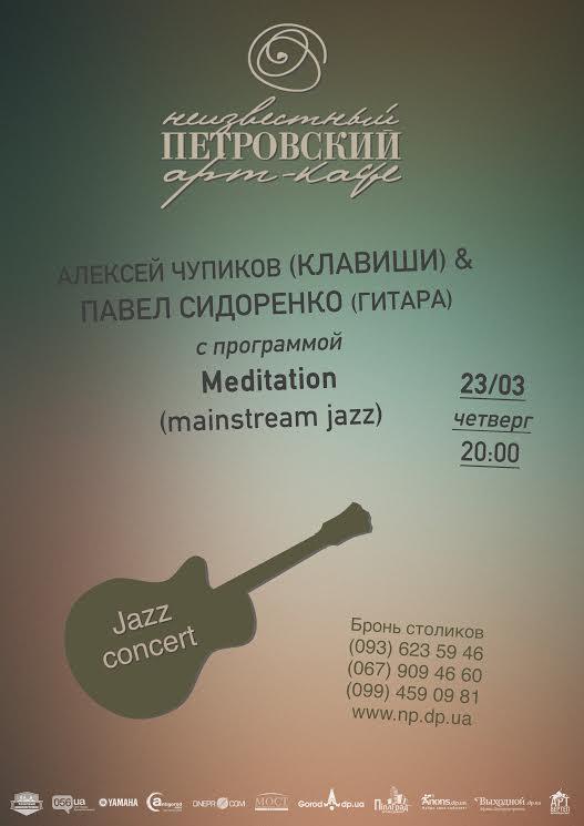 23 марта Алексей Чупиков (клавишные) и Павел Сидоренко (гитара) представят в арт-кафе Неизвестный Петровский программу Meditation, которая состоит из классических джазовых композиций. Особый акцент будет сделан на взаимодействие музыкантов во время исполнения. Вас ждет уютная атмосфера с легкими нотками романтического настроения.