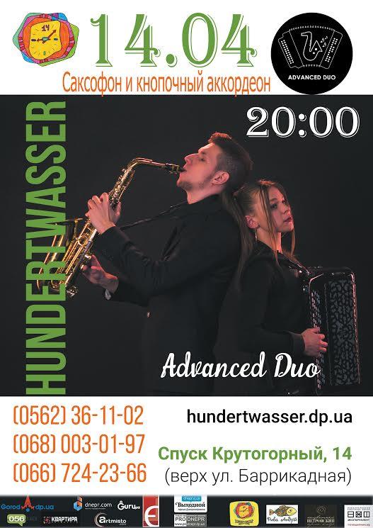 Музыкальный шоу-дуэт Advanced Duo достаточно уникальный проект в нашем городе, который исполняет свои авторские кавер-версии на хиты с мировым именем, многие из которых танцевального характера. Удивительным образом совмещая электронную музыку со звучанием живых инструментов и насыщая ее лучшими традициями ансамблевого исполнительства, создавая новое звучание известных хитов дуэт этих инструментов подарит вам эстетическое наслаждение!