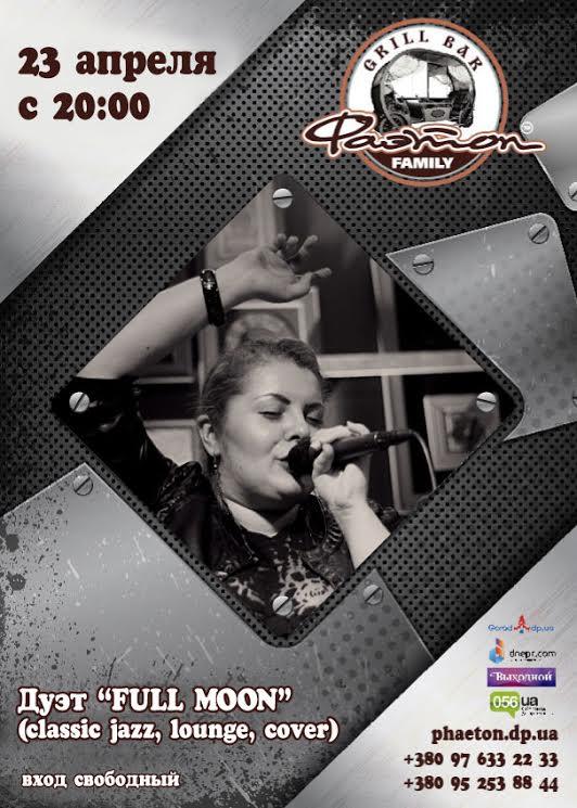 Весь вечер выходного дня для Вас будут петь и играть зачаровывающий Jazz-Cover дуэт ‘Full Moon’. Для Вас будут исполнены лучшие, популярные и не угасающие композиции джазовой эпохи в фирменных подачах и обработках.
