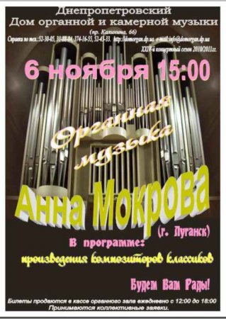 Музика 6 ноября, Анна Мокрова, Органный зал By Татьяна Иванова - 01.11.2010 00:00 0 12 Поділитися FacebookViberTelegramTwitterWhatsAppPinterestPrintEmail 6 ноября, Анна Мокрова, Органный зал6 ноября 2010 года, суббота, 15:00Анна Мокрова, из Луганска, исполнит органную музыку в нашем городе!Дом органной и камерной музыкипросп. Калинина, 66Тел.: 374-16-55, 52-41-08, 52-30-05, 52-43-33