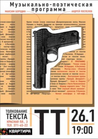 26 января с 19:00 Вы сможете насладиться музыкально-поэтической программой Толкование текстов в арт-центре Квартира!