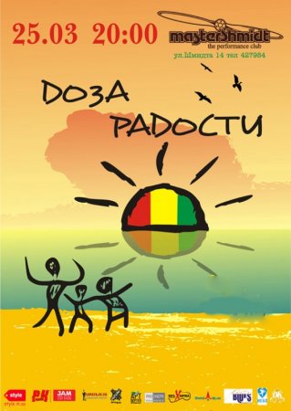 Итак, Вас ждет: два часа драйва, положительные эмоции, директор кирпичного завода, Юрбан и его барабан, реггей без гадости, 013 в Тентуре, эдинбург, Пинаколада, слабые доли сильнее сильных , 7-е облака , гитара-бас, ритмы Карибского бассейна, саксофон-мелофон и 3 минуты без света ,что еще нужно для хорошего настроения и позитивного отдыха? А если добавить к этому энергичное ска , разбавленное бесшабашным фанком , безобразие красок и танцев на сцене и в зале, получится концерт группы Доза Радости в городе Днепропетровске, в стенах клуба MasterShmidt .