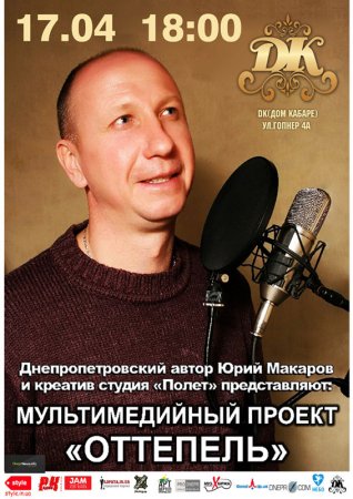 Юрий Макаров автор книги повестей ‘Автобус времени. Торт жизни’, оригинальный писатель, совмещающий в своём творчестве мультимедийный эффект: прозаик не только переводит свои произведения в аудиоформат, но также привносит в них – мощный визуальный ряд и не менее яркое музыкальное сопровождение. В этом стиле исполнен проект ‘Ассоциации’ неоднократно презентовавшийся на разных площадках Днепропетровска.