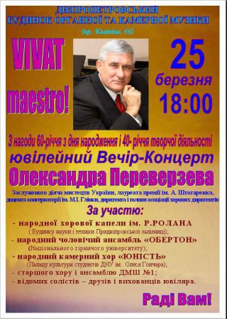 З нагоди 60-річчя з дня народження і 40-річчя творчої діяльності Олександра Переверзева, заслуженого діяча мистецтв України, лауреата премії ім.А.Штогаренка, доцента консерваторії ім.М.І.Глінки, диригента і голови асоціації хорових диригентів