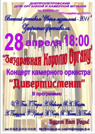 Заздравная Королю Органу. Концерт камерного оркестра Дивертисмент, дирижер Игорь Горский. В программе звучит : И.С.Бах, Г.Гендель, А.Вивальди, В.А.Моцарт, А.Пьяццолла, Ф.Крейслер, М.Кьяра, В.Монти, Н.Боева.