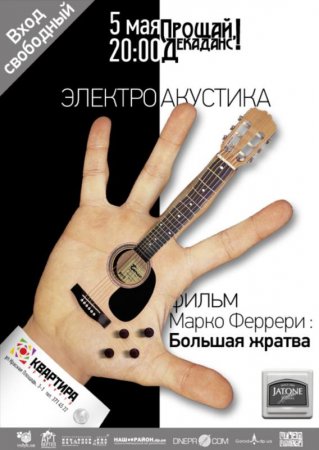 5 мая в 20.00 арт-центр Квартира приглашает всех друзей на концерт группы ‘Прощай, Декаданс!’ (электроакустика) и фильм ‘Большая жратва’. Партнером вечера выступит торговая марка Jatone.