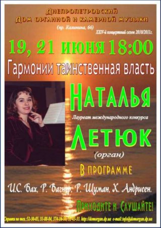 <,br />,<,strong>,<,em>,<,strong>,Гармонии таинственная власть<,/strong>,<,/em>,<,/strong>,<,/p>, <,p>,<,em>,<,/em>,Лауреат международного конкурса Наталья Летюк(орган).<,/p>, <,p>,<,strong>,<,/strong>,<,strong>,В программе:<,/strong>, Х. Андрисен, Й. Райнбергер,И.С. Бах, Р. Вагнер, Р. Шуман.<,/p>, <,p>,<,a href=’https://dnepr.com/wiki/%D0%94%D0%BE%D0%BC_%D0%BE%D1%80%D0%B3%D0%B0%D0%BD%D0%BD%D0%BE%D0%B9_%D0%B8_%D0%BA%D0%B0%D0%BC%D0%B5%D1%80%D0%BD%D0%BE%D0%B9_%D0%BC%D1%83%D0%B7%D1%8B%D0%BA%D0%B8’>,<,strong>,<,em>,<,span style=’text-decoration: underline,’>,<,span style=’color: #000080,’>,Дом органной и камерной музыки<,/span>,<,/span>,<,/em>,<,/strong>,<,/a>,<,/p>, <,p>,<,span style=’line-height: 16px,’>,<,strong>,Находится:<,/strong>,г. Днепропетровск, проспект Калинина, 66.<,/span>,<,/p>, <,p style=’margin-top: 0.4em, margin-right: 0px, margin-bottom: 0.5em, margin-left: 0px, line-height: 1.5em,’>,<,strong>,Тел<,/strong>,.: 52-41-08, концертный отдел: 52-30-05, продажа билетов: 52-30-05, 31-88-84<,/p>, <,p style=’margin-top: 0.4em, margin-right: 0px, margin-bottom: 0.5em, margin-left: 0px, line-height: 1.5em,’>,<,strong>,Начало<,/strong>,: 18:00<,/p>, <,p style=’margin-top: 0.4em, margin-right: 0px, margin-bottom: 0.5em, margin-left: 0px, line-height: 1.5em,’>,<,/p>,