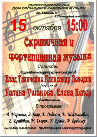 В программе: А.Марчелло, Э.Элгар, К.Дебюсси, Д.Шостакович, Б.Бриттен, М.Скорик, И.Брамс, Ф.Крейслер.