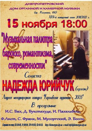 В программе: И.С.Бах, Д.Букстехуде, И.Пахельбель, Ф.Лист, С.Франк, М.Мусоргский, Э.Босси.