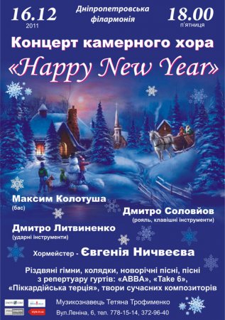 16 декабря, Концерт камерного хору «Happy New Year»У програмі:різдвяні гімни, колядки, новорічні пісні, пісні з репертуару гуртів: АВВА, Таke 6, Піккардійська терція, твори сучасних композиторів